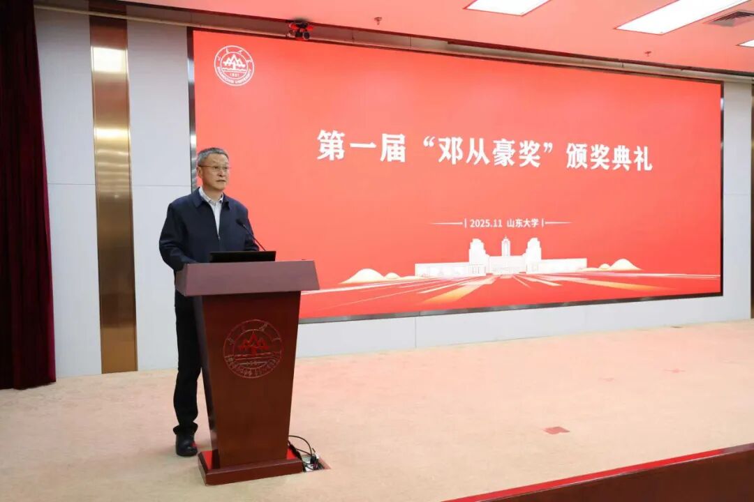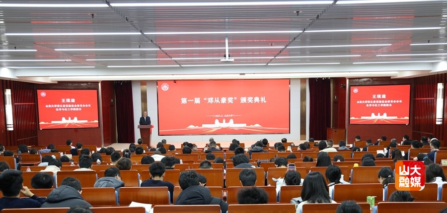 11月22日,山东大学第一届“邓从豪奖”颁奖典礼在山东大学中心校区举行。中国科学院生态环境研究中心研究员、中国科学院院士、1977级校友江桂斌,中国科学院上海有机化学研究所研究员、中国科学院院士、1980级校友马大为,山东大学常务副校长吴臻,邓从豪奖励基金委员会副会长、山东红四月控股集团有限公司董事长段秀峰出席典礼。山东大学化学与化工学院院长王琪珑主持典礼。