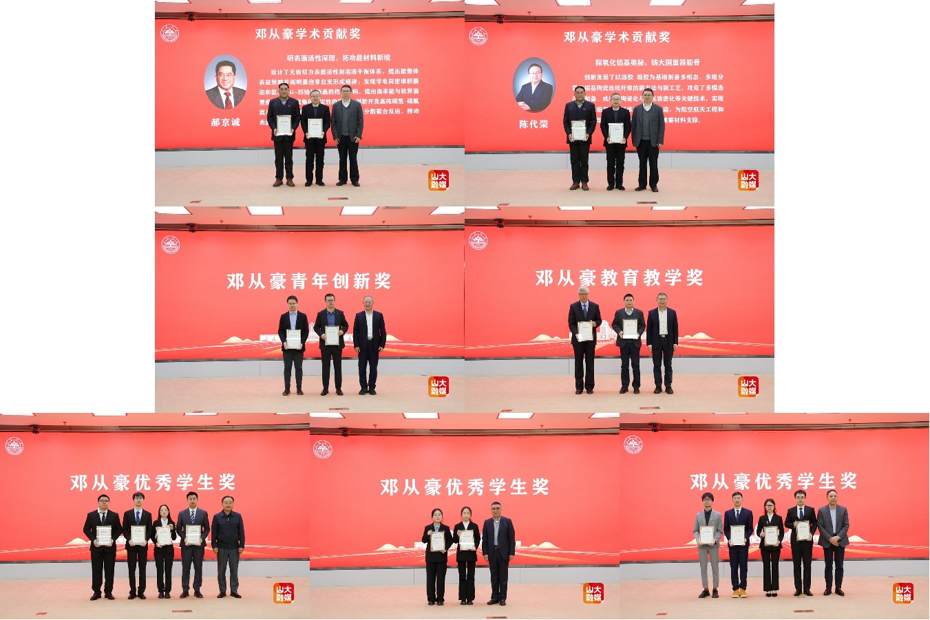 吴臻、江桂斌、马大为分别为邓从豪学术贡献奖、邓从豪青年创新奖、邓从豪教育教学奖获得者颁奖。山东省商业集团党委书记、董事长、1983级校友王绪超,段秀峰,山东润华物业管理有限公司董事长、1988级校友杨立群共同为邓从豪优秀学生奖获奖者颁奖。